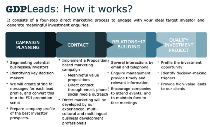 We work with clients from well-established agencies and ministries and trade and investment organisations in Europe, North America, Latin America, Africa and Asia-Pacific. We take the view that results can only be achieved when the objectives are realistic and the approach is carefully structured. GDP is involved in all stages of the investment promotion cycle.