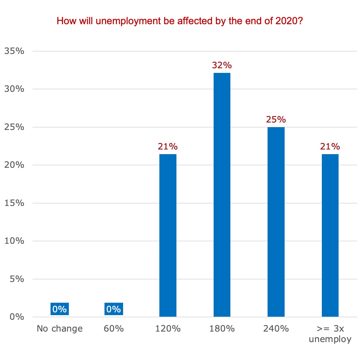 - Pessimism is also evident among IPAs about the likely impact on unemployment. 33.3% of respondents believe that unemployment could double by the end of 2020; 26.7% that it could increase by between 2 and 3 times; and 20% expect it to triple.