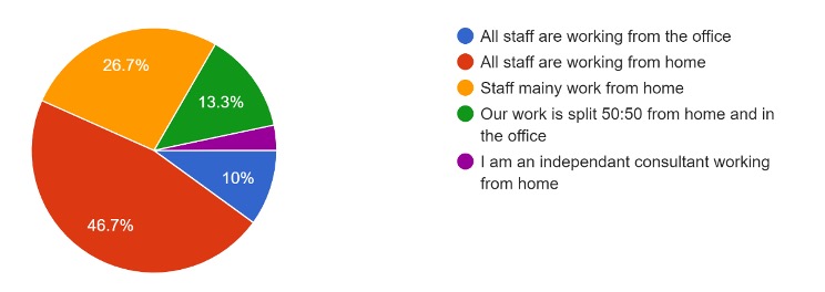 - Equally striking is the effect of COVID 19 on working methods of the IPAs. 46.7% of respondents said that all staff worked from home; and a further 26.7% reported that most staff did so. Only 10% of those questioned said that all their staff worked in their offices.