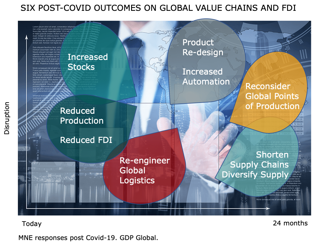 So, with global economies in sharp recession and global trade paralysed till Q3/4, the prospects for FDI are also dire. FDI flows will be negative in all economies as investors put their plans on ice as the inherent risks of globalisation and global value chains become reality. UNCTAD forecasts FDI flows could decline between 30% and 40% during 2020-2021. GDP expects that whilst there will be some new FDI it follows that there will be significant downsizing or even closure foreign plants around the world.